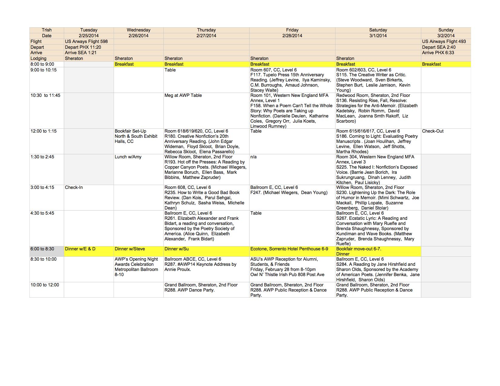 Although it seems impossible, AWP 2014 in Seattle will be my 20 Year AWP Anniversary. My first was AWP 1994 in Tempe. I was a graduate student at the time so I volunteered at the conference, which was held entirely at the Tempe Mission Palms (a tiny venue compared to what you see today). I skipped a few in between, but I think Seattle will make my 15th AWP total? Ish. Can’t remember. But I do really enjoy attending the conference and going to panels and seeing friends I have not seen in ages and hearing poets and writers talk about their work and ideas.