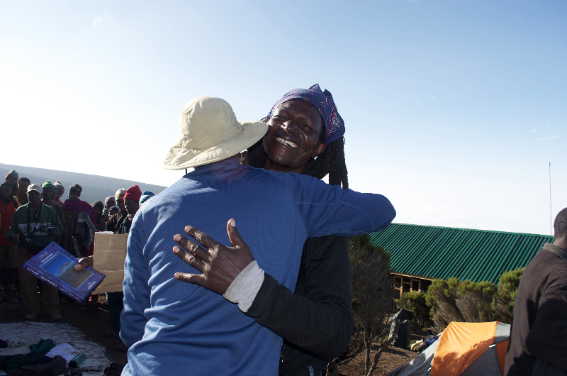 John presents Kapanya with a Kilimanjaro book.
