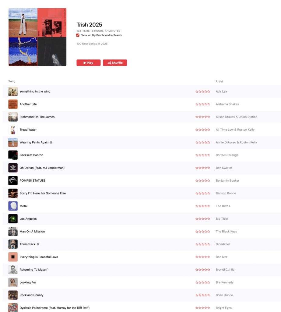To collect music I use Apple Music. They make a new playlist for me every Friday, and they also have a category with Newly Released albums and songs. I collected 132 songs by individual artists that were recorded in 2025. You can listen to the playlist here. Some of my favorite songs were “Metal” by The Beths and “Bottom of a Bottle” by Julien Baker & TORRES.