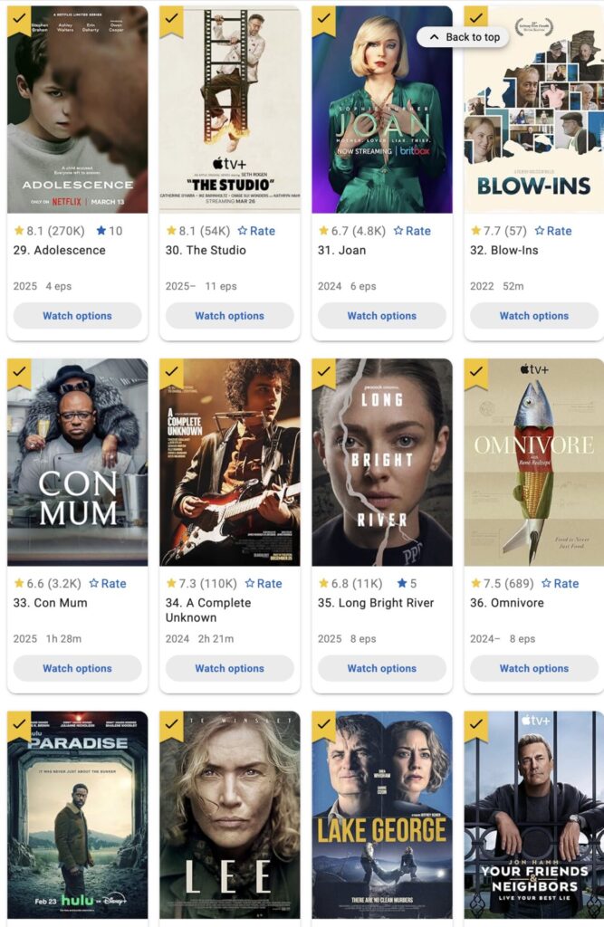 I use IMDB to track my viewing habits. I hit an even 100 with viewing movies and shows in 2025! You can see the whole list here. Adolescence was a hard watch but so impactful. Paradise surprised me because I normally don’t like to suspend reality but this show made it worth it. I LOVED the Devo documentary.