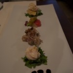 - A really delcious sampler of Angler fish with lemon and almonds, scampi on grapefruit, and scallop carpaccio.